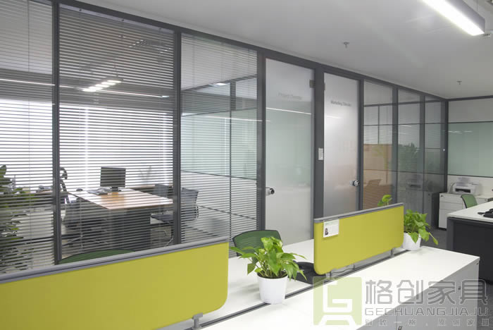 透明玻璃與百葉結合:這種做法是辦公室隔斷墻最常見的,也稱為百葉隔斷墻,不僅可以用在走道、各經理室,就連董事辦公室也可以用,因為它可以手動調節,讓辦公空間隱秘與開放性隨時切換,非常的美觀、氣派。其次按照材質百葉隔斷墻還可以分為多種的,格創辦公家具網小編為大家列出了以下分類,僅供參考。