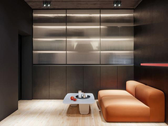 活力珊瑚橘配色,是本案的亮點。粗礪硬朗的混凝土頂面、暗黑色的背景,與柔美的珊瑚橘和干凈的磨砂白制作的屏風立面形成鮮明的質感對比。會議室延續這樣的設計手法,以輕柔與暗黑的對比,帶來強烈的視覺美感。